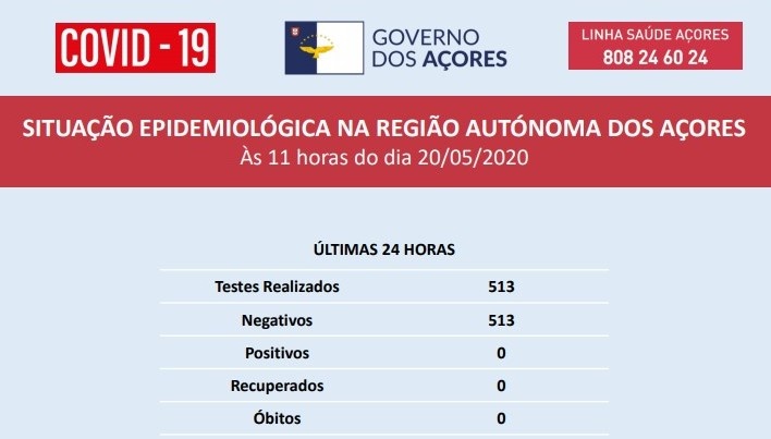 A Autoridade de Saúde Regional informa que as 513 análises realizadas nos dois laboratórios de referência da Região nas últimas 24 horas não revelaram novos casos positivos de COVID-19.
