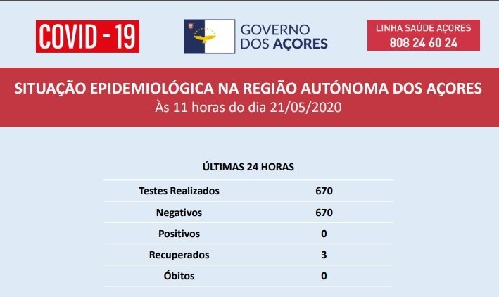 A Autoridade de Saúde Regional informa que as 670 análises realizadas nos dois laboratórios de referência da Região nas últimas 24 horas não revelaram novos casos positivos de COVID-19.