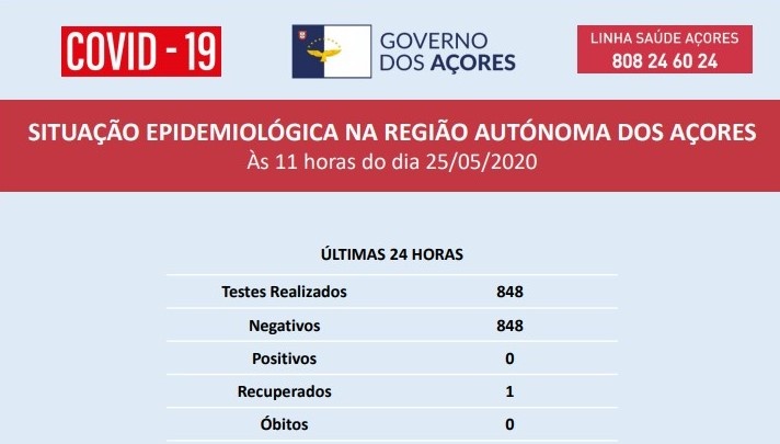 A Autoridade de Saúde Regional informa que as 848 análises realizadas nos dois laboratórios de referência da Região nas últimas 24 horas não revelaram novos casos positivos de COVID-19.