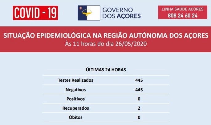 A Autoridade de Saúde Regional informa que as 445 análises realizadas nos dois laboratórios de referência da Região nas últimas 24 horas não revelaram novos casos positivos de COVID-19.