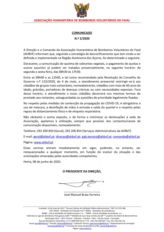 A Direção e o Comando da Associação Humanitária de Bombeiros Voluntários do Faial (AHBVF) informam que, seguindo a estratégia de desconfinamento que tem vindo a ser definida e implementada na Região Autónoma dos Açores, foi determinado o seguinte: