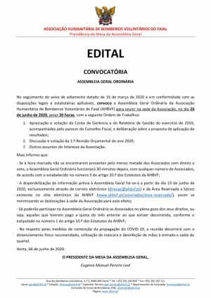 No seguimento do aviso de adiamento datado de 16 de março de 2020 e em conformidade com as disposições legais e estatutárias aplicáveis, convoco a Assembleia Geral Ordinária da Associação Humanitária de Bombeiros Voluntários do Faial (AHBVF) para reunir na sede da Associação, no dia 26 de junho de 2020, pelas 20 horas, com a seguinte Ordem de Trabalhos: