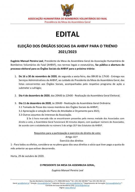 Eugénio Manuel Pereira Leal, Presidente da Mesa da Assembleia Geral da Associação Humanitária de Bombeiros Voluntários do Faial (AHBVF), nos termos legais e estatutários, faz pública a abertura do processo eleitoral para os Órgãos Sociais da AHBVF para o próximo triénio: