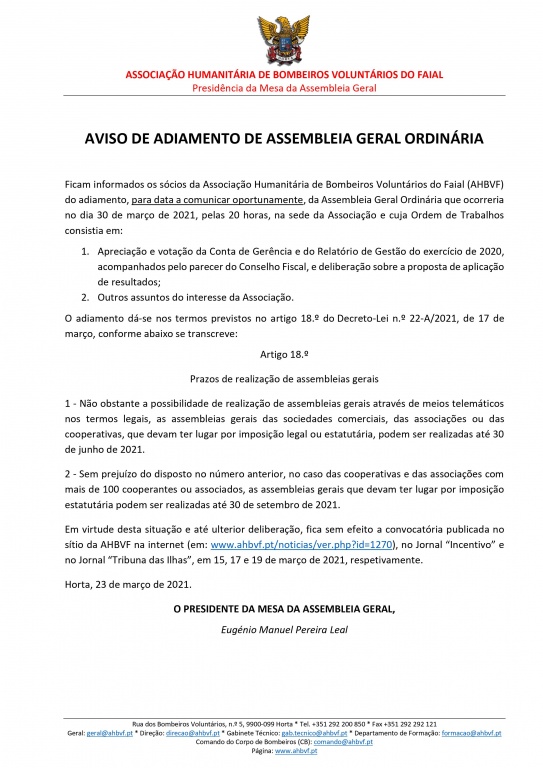 Ficam informados os sócios da Associação Humanitária de Bombeiros Voluntários do Faial (AHBVF) do adiamento, para data a comunicar oportunamente, da Assembleia Geral Ordinária que ocorreria no dia 30 de março de 2021, pelas 20 horas, na sede da Associação e cuja Ordem de Trabalhos consistia em: