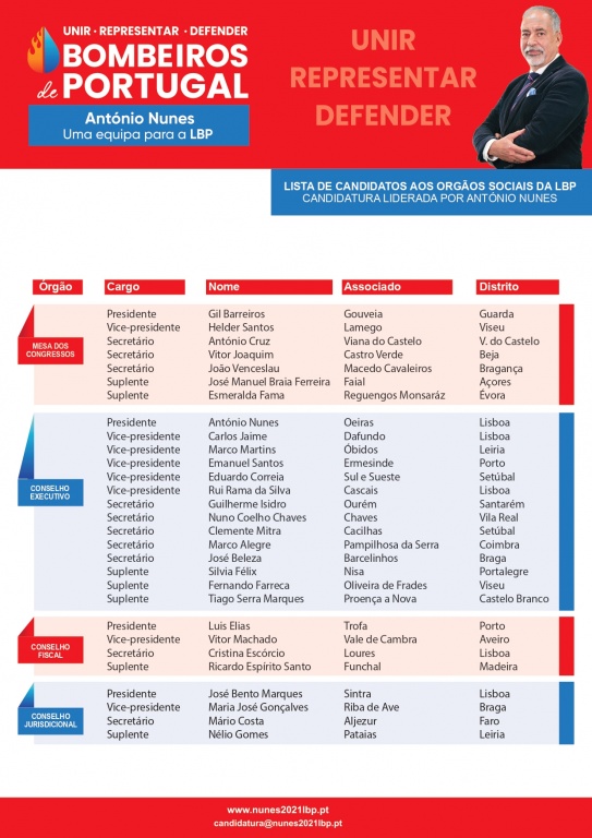 Sob o lema “Unir, Representar, Defender os Bombeiros de Portugal”, a equipa liderada por António Nunes, que se apresentará a sufrágio e da qual faz parte o Presidente da Direção da AHBVF, é uma equipa: